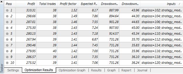 Neste exemplo, testamos o número máximo de posições de compra ou venda. O otimizador testará todas as possibilidades com 10 posições, 11, 12... até 15.