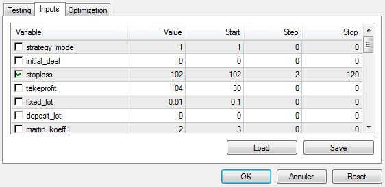 Na janela do testador de estratégias, marque a caixa «otimização» e clique no botão «valor inicial» para iniciar a otimização.